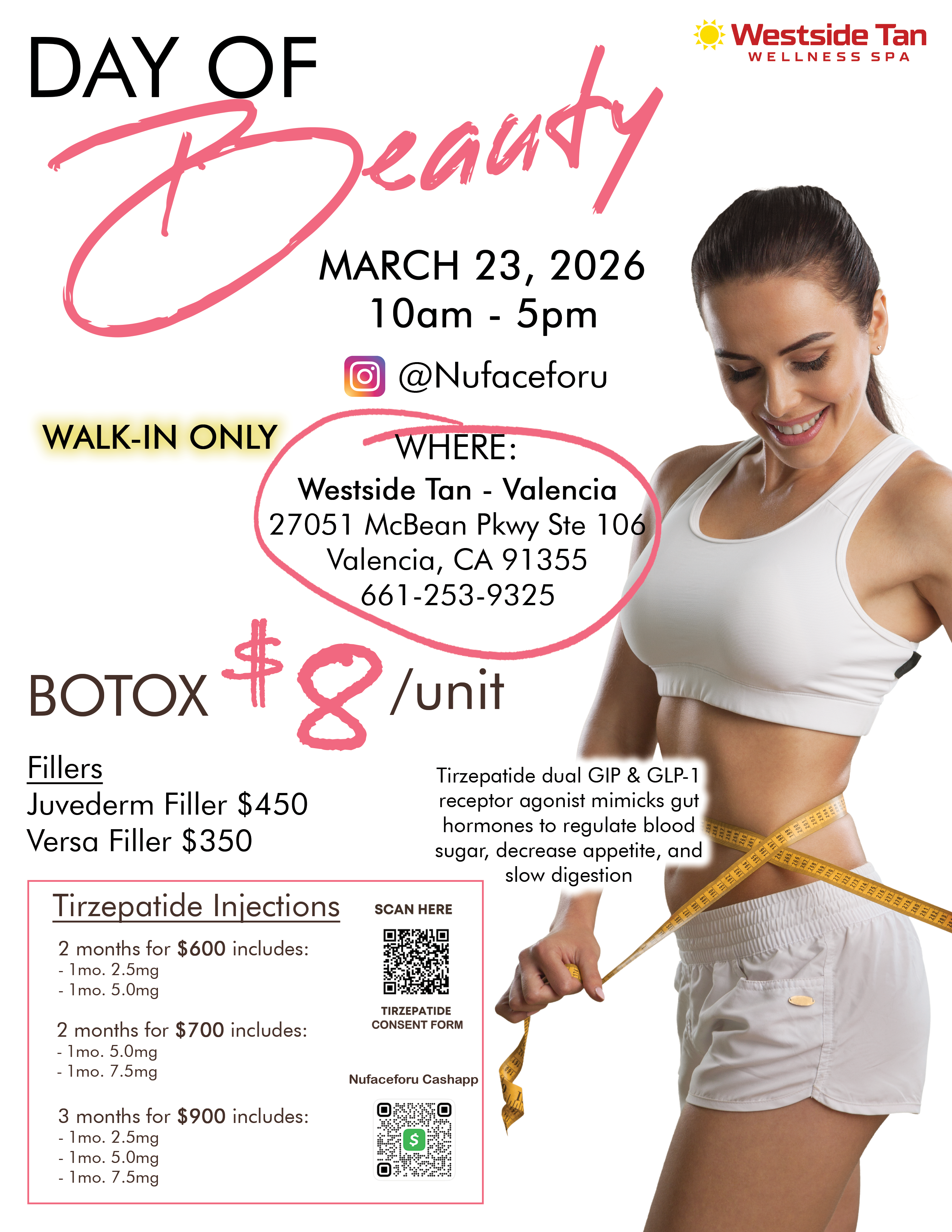 Nufaceforu is coming to Westside Tan - Valencia for a special Day of Beauty event! Lily from Nufaceforu will be taking walk-ins only for botox, fillers, and Tirzepatide injections at exclusive prices! Visit us on March 23rd in Valencia for this one-day event and get summer ready!